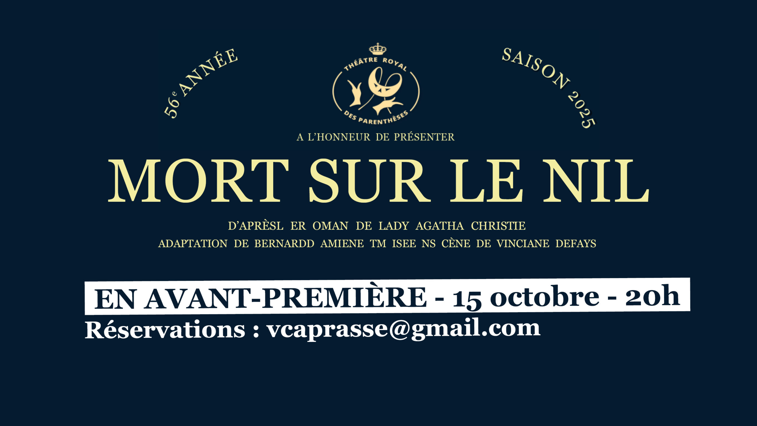 Plongez dans l’univers envoûtant et mystérieux de la reine du crime, où une croisière idyllique sur le Nil se transforme en huis clos angoissant… Une enquête haletante menée par le célèbre Hercule Poirot, interprétée avec brio par la troupe du Théâtre Royal des Parenthèses de Kraainem.